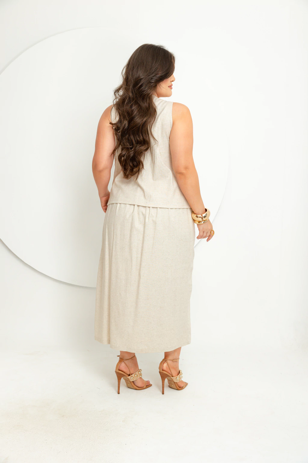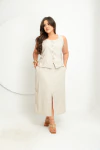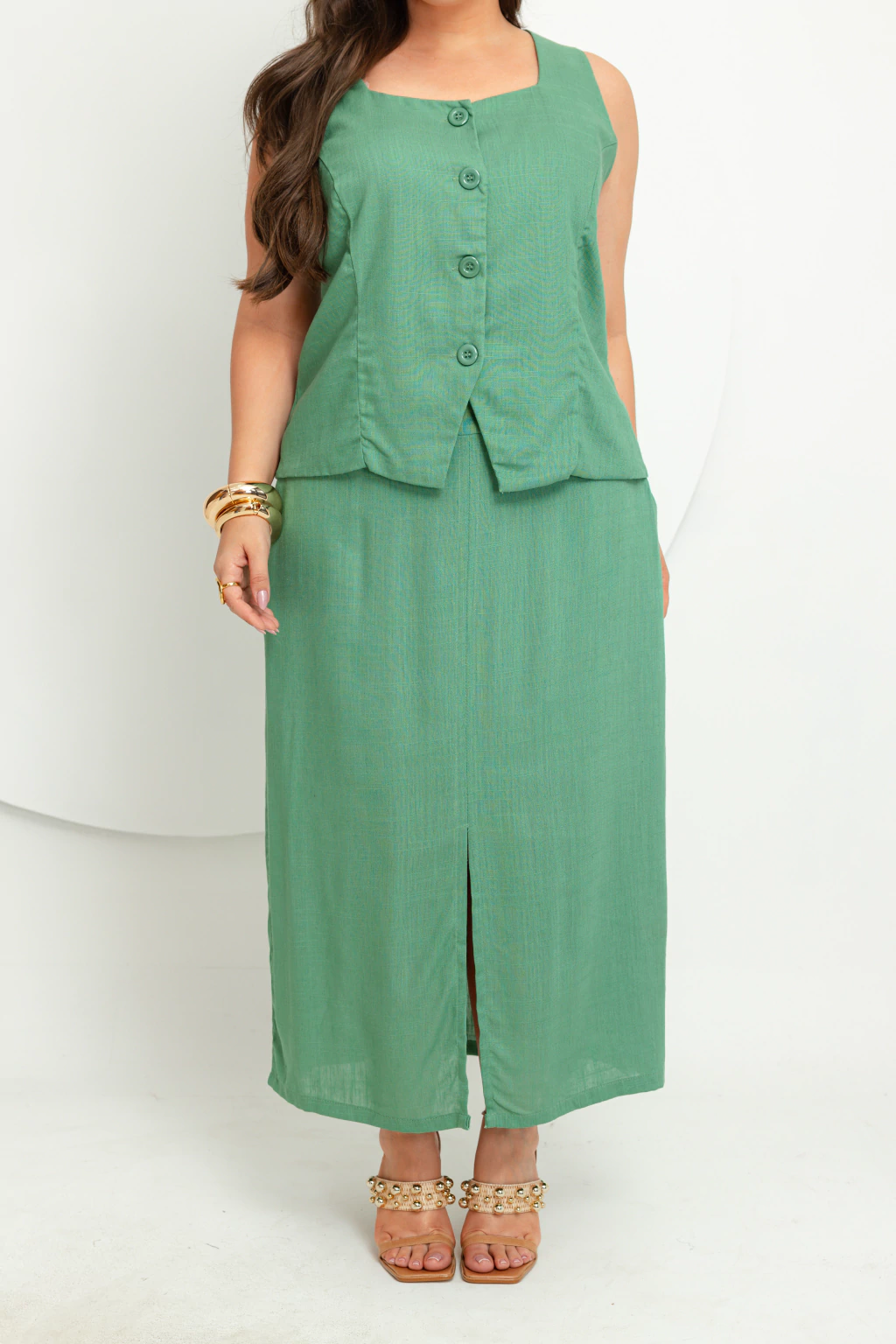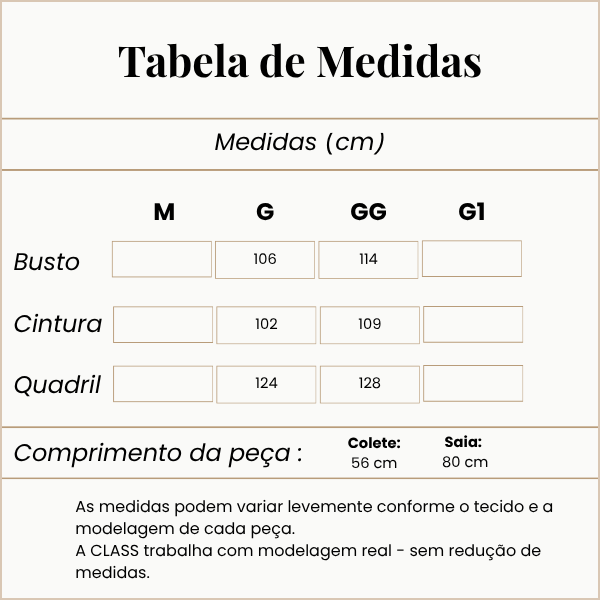 Possui colete com botões frontais funcionais e saia midi com fenda frontal, que valoriza o corpo e proporciona liberdade ao caminhar.